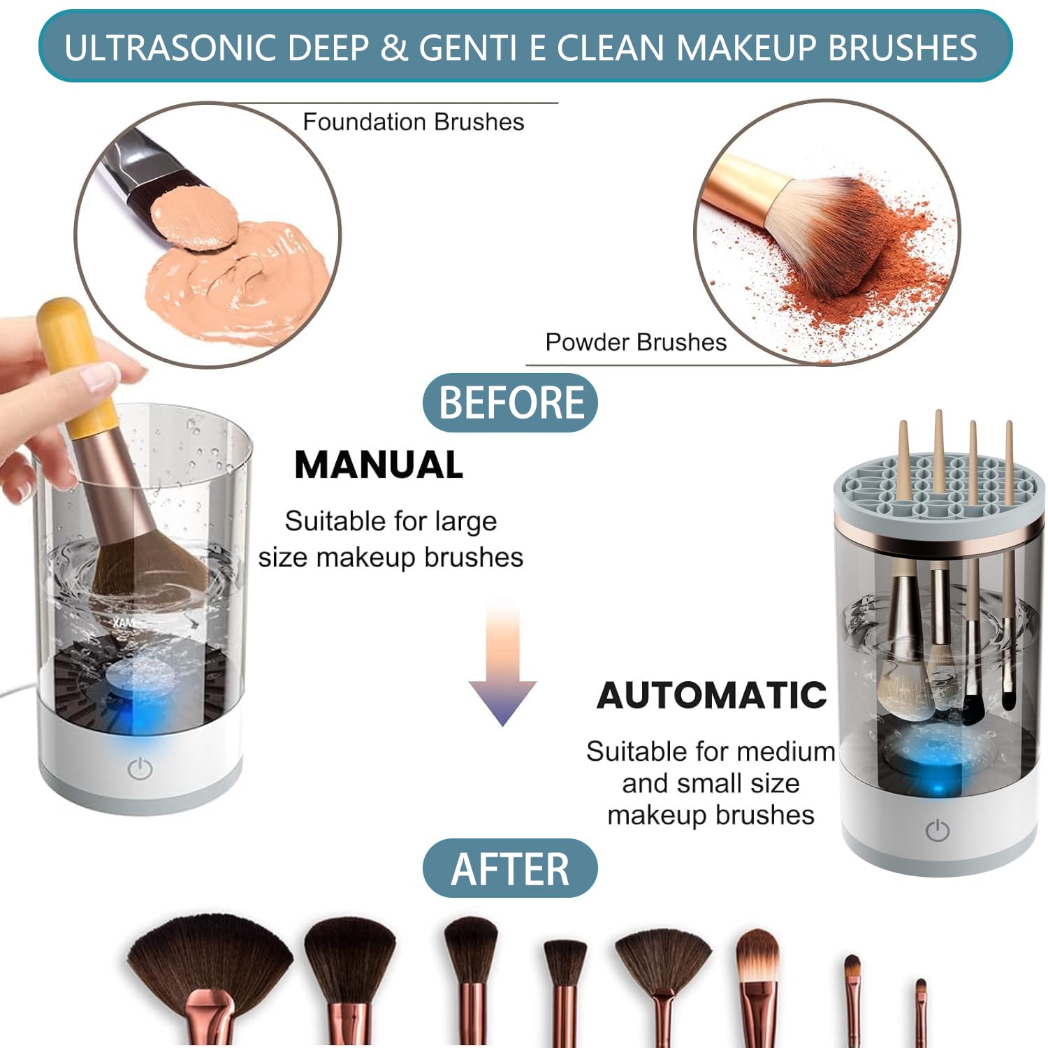 Compact et Portable: Avec son design élégant et compact, notre nettoyeur automatique de pinceaux de maquillage s'intègre facilement dans votre collection de maquillage, offrant une touche de style à votre routine beauté.